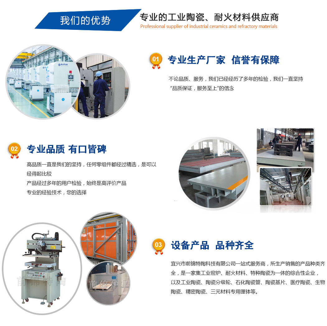 宜興市前錦特陶有限公司作為成員企業之一,公司主要生產工業陶瓷、窯具、匣缽、窯爐內襯系列。工業陶瓷以生產氧化鋯陶瓷、氧化鋁陶瓷、碳化硅陶瓷、氮化硅陶瓷等先進陶瓷為主;碳化硅制品有碳化硅異形件、三明治板、爐管等系列;耐火高溫窯具為剛玉爐管、剛玉莫來石制品、剛玉推板等產品;以及燒結墊板、氧化鋁空心球制品、sic板、石墨坩堝、堇青石復合莫來石板移進板、鋯粉、氮化硅陶瓷環、陶瓷棒、石化陶瓷管、陶瓷基片、磨介、分級輪和氮化硅球閥、熱電偶保護管、升液管等...